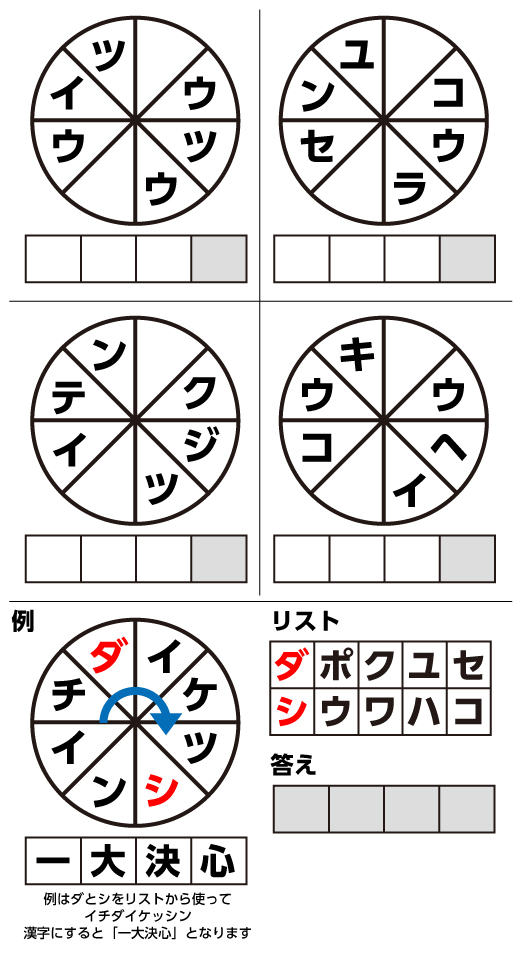 円に囲まれた文字はある地点から時計回りに読めば、四文字の熟語・言葉になります。 見えない部分はリストから使ってください。 出来た四文字熟語のグレーの部分を組み合わせ、できる四文字熟語はなんでしょう?
