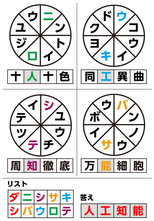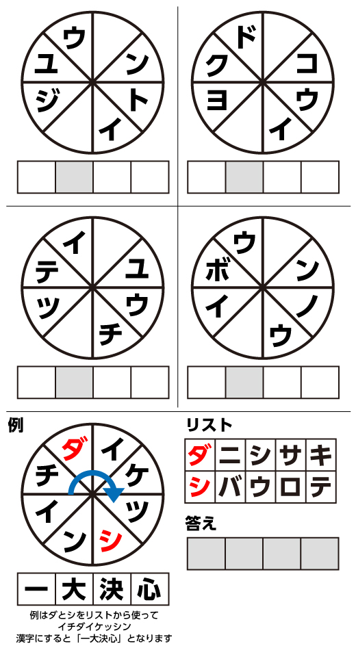 円に囲まれた文字はある地点から時計回りに読めば、四文字の熟語・言葉になります。 見えない部分はリストから使ってください。 出来た四文字熟語のグレーの部分を組み合わせ、できる四文字熟語はなんでしょう?