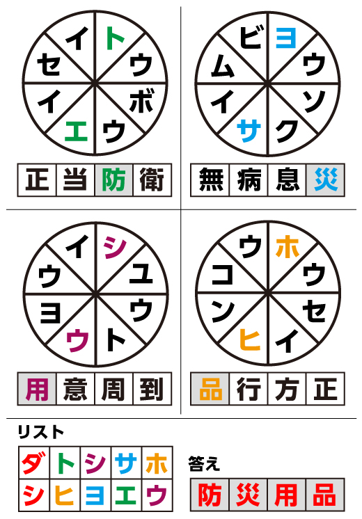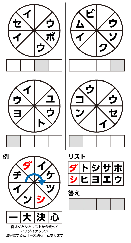 円に囲まれた文字はある地点から時計回りに読めば、四文字の熟語・言葉になります。 見えない部分はリストから使ってください。 出来た四文字熟語のグレーの部分を組み合わせ、できる四文字熟語はなんでしょう?
